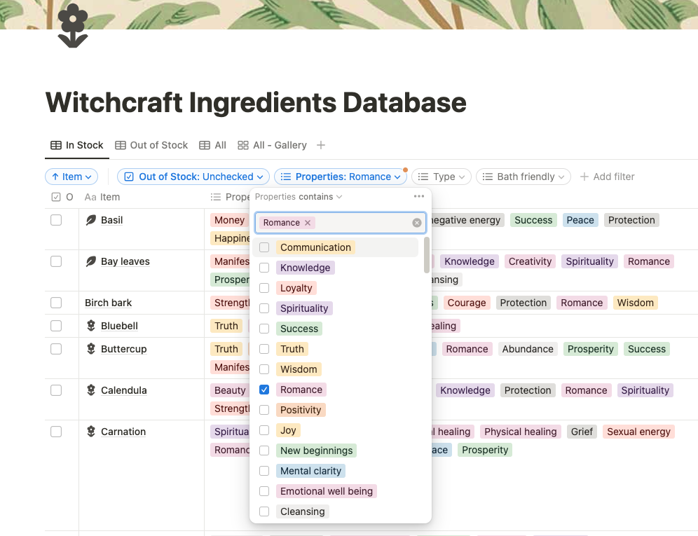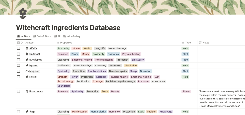 You can sort by in stock and out of stock. You can sort by properties (protection, happiness, etc.). The download will come with instructions for copying it to your notion library.